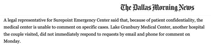 Dallas News reported that the couple then drove to a hospital — Lake Granbury Medical Center — where they had given birth to their first child and where it was confirmed that their second baby had died. Doctors there told the couple that the situation wasn’t an emergency and offered to schedule a D&C at some point over the next two weeks. (A D&C to remove the remains of a deceased baby is 100% legal in Texas and every state.)