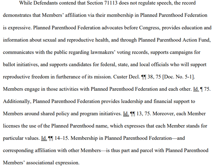 Talwani’s legal theory is that Planned Parenthood affiliates have a right of speech and association to continue receiving taxpayer money over the objections of Congress if the affiliates in states where abortion is banned do not perform abortions, and that Planned Parenthood performing abortions and engaging in politics with the financial benefits of taxpayer funding is an “expressive” right that Congress must fund.