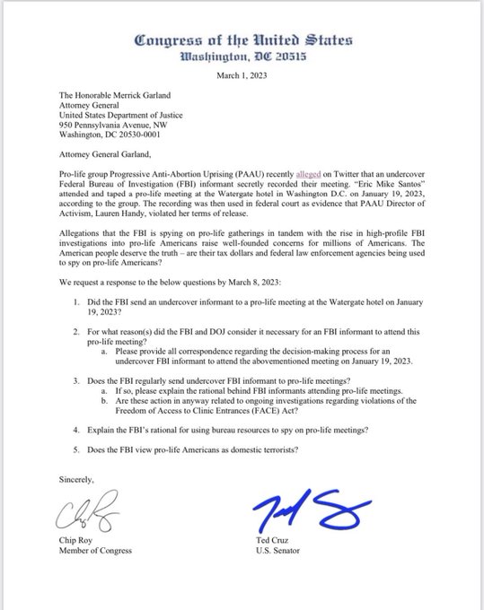 On March 2, 2023, two Republican U.S. lawmakers from Texas — Rep. Chip Roy and Senator Ted Cruz — wrote a letter to AG Merrick Garland demanding to know why the Federal Bureau of Investigation sent an informant into a pro-life meeting, and asked if the agency views pro-life Americans as domestic terrorists.