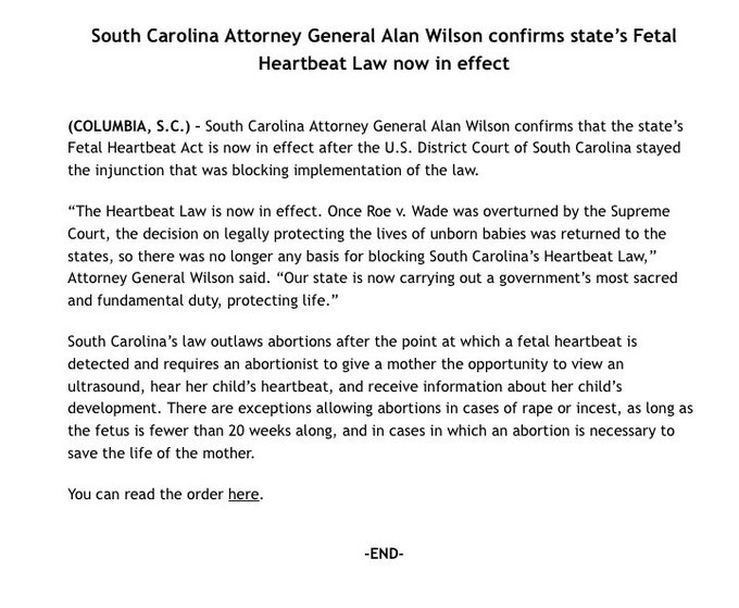 “The Heartbeat Law is now in effect,” said South Carolina Attorney General Alan Wilson in a statement. “Once Roe v. Wade was overturned by the Supreme Court, the decision on legally protecting the lives of unborn babies was returned to the states, so there was no longer any basis for blocking South Carolina’s Heartbeat Law.